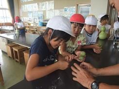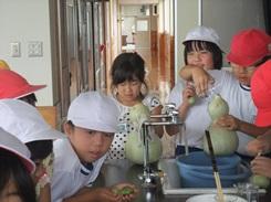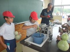4年生が理科の学習で育てたひょうたんが見事に実り、昼休みを使ってひょうたん作りに取り組んでいます。薬品を使い酵素の力で中身を溶かしていくことに挑戦中です。子どもたちは、マイひょうたんができることを目指して夢中で取り組んでいます。