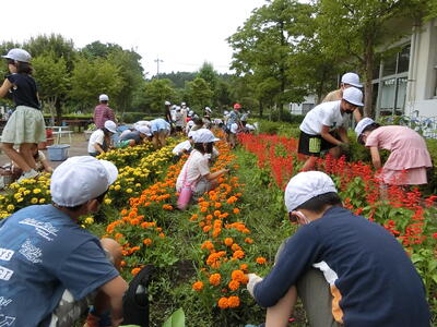 間引き作業後は、花壇や校庭の除草作業を行いました。異学年で協力して黙々と働くのが「乙畑っ子」の素晴らしい所です。