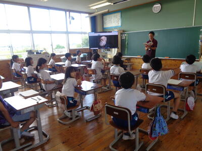 校長が担任だった時に、子どもたちが取り組んだ印象的な学習を紹介すると、子どもたちは驚きの表情を見せました。