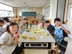 今日は5年生の調理実習がありました。初めての実習では、野菜を切ったり、ゆでたり、ゆで卵も入れたサラダ作りです。「卵は水から?野菜はお湯から?」「何分ゆでるの?」「終わった順に片付けよう」などみんなで力を合わせて、おいしいサラダができあがりました。ドレッシング作りは案外難しかったようです。
