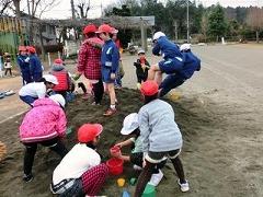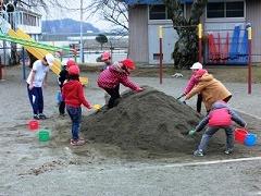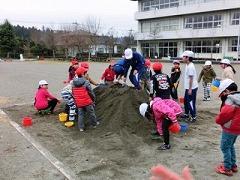 今日の朝、登校した子どもたちの目に留まったものは、砂場に出現した山でした。子どもたちは、休み時間になるのが待ち遠しかったらしく、一人ふたりと集まりだし、あっという間に人盛りになりました。新しいものに触れる楽しみは、子どもたちも大人も同じですね。