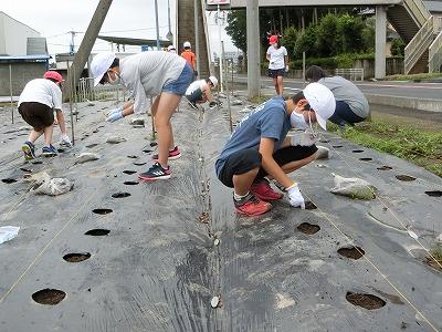 梅雨の晴れ間に、秋に咲くひまわりの種まきをしました。種まきも今年は分散で行います。最初は1年生と6年生です。6年生が1年生に蒔き方を教えます。6年生は今年で最後のひまわり活動なので、伝統を引き継いだ感じです。1年生は6年生の話をしっかり聞いて指で穴をあけて一生懸命種まきをしました。