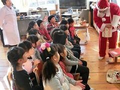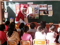 実は、お話ポットの会の読み聞かせでのことです。教室にサンタが現れると歓声が上がり、目を輝かせた1年生は、袋から出てくる絵や写真、そしてサンタの話に興味津々でした。