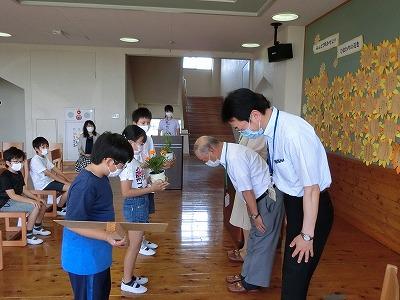 今日の朝会は「人権の花贈呈式」でした。人権擁護委員の皆様から来校いただき、贈呈式を行いました。3密を避けるため多目的ホールには6年生だけが出席し、他の学年はオンラインで、各教室で参加しました。
