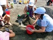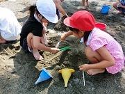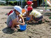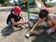 1校時には、1年生が砂場で図工の授業です。いつもは3校時ですが、今日は朝から陽ざしが強いため、校時を変更して実施しました。途中、水分を摂りながら、元気に活動していました。