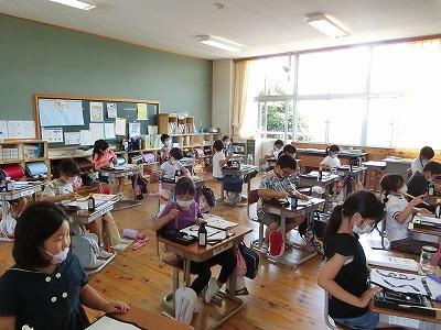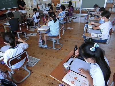 3年生の教室では、初めての毛筆お習字をしていました。「紙はつるつるの方に書きましょう」の声に、指で触って確かめてそおーっと下敷きの上に。筆に墨を含ませ元気よく「一」を書いていました。初めて経験する子も多く、慎重に真剣に、鉛筆とも絵の具のふでとも違う感触を味わっていました。