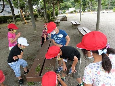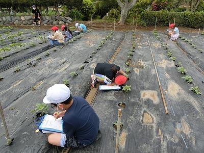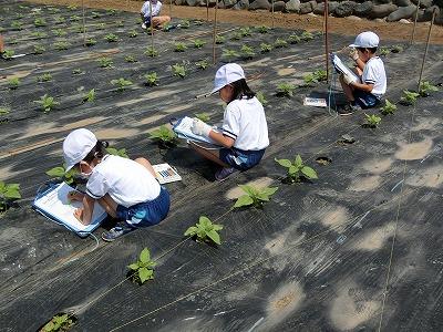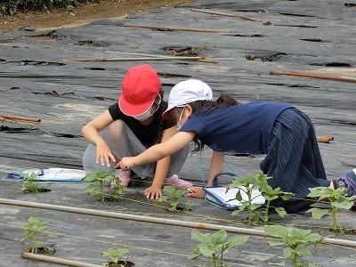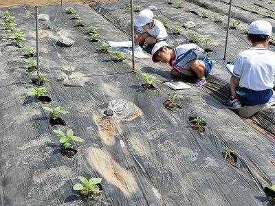 ひまわり畑では、3年生がひまわりの観察です。先日の雹の被害で葉がボロボロになっっているところもあり、びっくりしていました。それでもグングン育っている様子を、葉の数を数えたり高さを計ったりして記録していました。
