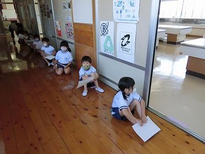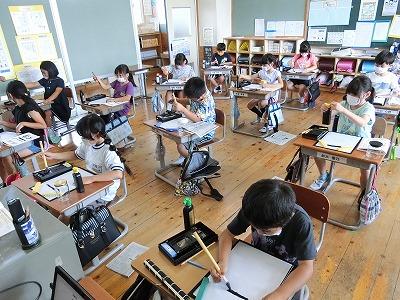 3年生の教室では、初めての毛筆お習字をしていました。「紙はつるつるの方に書きましょう」の声に、指で触って確かめてそおーっと下敷きの上に。筆に墨を含ませ元気よく「一」を書いていました。初めて経験する子も多く、慎重に真剣に、鉛筆とも絵の具のふでとも違う感触を味わっていました。