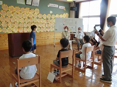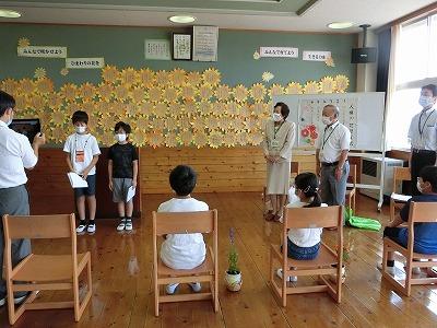 人権擁護委員の皆様から人権についてのお話をお聞きしました。思いやり やさしさの心を大切に、人も花も他と比べることなくそれぞれの花を精一杯咲かせましょう。人権の花を育てることで、命を大切にしてほしい、この花の命が終わるまで大切に育ててくださいというお話がありました。そして金子みすゞの「わたしと小鳥と鈴と」をみんなで一緒に朗読しました。とても心に残る贈呈式でした。