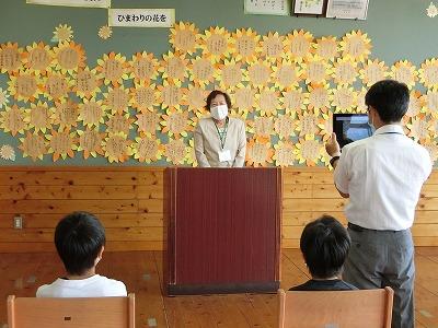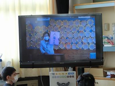 今日の朝会は「人権の花贈呈式」でした。人権擁護委員の皆様から来校いただき、贈呈式を行いました。3密を避けるため多目的ホールには6年生だけが出席し、他の学年はオンラインで、各教室で参加しました。