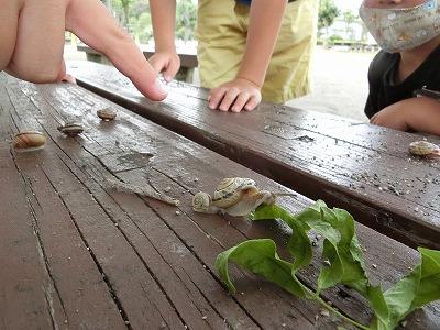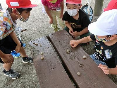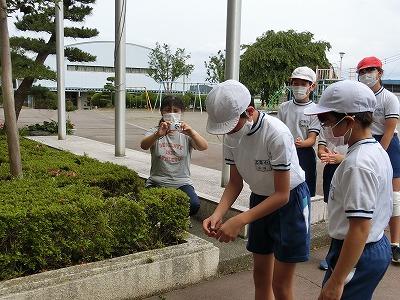 昼休み藤棚の下に子ども達が集まっています。いってみるとベンチの上にかたつむりがいっぱい。「生きているのがいっぱいいたんだ。」とみんなの目が釘付けです。葉っぱをあげようとする子、体に手で触っちゃだめだよと教えている子、恐る恐るそっと殻を触っている子、自然が教えてくれる素敵な学びの場です。「あかちゃんがいるんだよ」と教えてもらい、よく見ると本当に親子のようでした。ひとしきり観察した後、「教室で飼いたい」ということになり、何匹かは1年教室にいくことになりました。