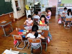今日は、1・2年生が近所でもらった篠竹に七夕飾りをしました。1年生は、初めてなので、楽みにしていた活動です。自分の作った飾りを一生懸命篠竹に付けていました。