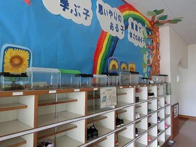 ずらりと並んでいます。そして「リーンリーン」や「ギっ ギッ」というかわいらしい鳴き声も聞こえてきます。1年生がとってきたバッタにすみかをつくり、お世話をしてしばらくの間飼育するのです。学校内に虫の声が響き、一層秋を感じます。