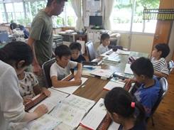 4年生の算数の時間です。そろばん指導は、担任だけでなくティームティーチングで行いました。一緒に教えていただいたのは、本校技術員の田代さんです。田代さんは指導者資格もお持ちのそろばんの達人です。この日は暑かったため、クーラーのある部屋に、全校生分かれて学習した日でした。4年生は職員室での学習でした。