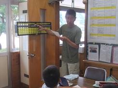 4年生の算数の時間です。そろばん指導は、担任だけでなくティームティーチングで行いました。一緒に教えていただいたのは、本校技術員の田代さんです。田代さんは指導者資格もお持ちのそろばんの達人です。この日は暑かったため、クーラーのある部屋に、全校生分かれて学習した日でした。4年生は職員室での学習でした。