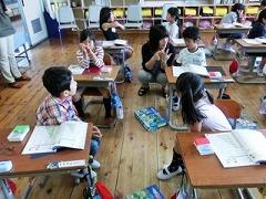1年生の算数です。「9」はいくつといくつ?という授業で、道具を使ったり、友だちと話し合ったり、元気な楽しい授業でした。