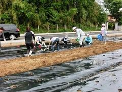 昨日の午前8時半から、PTAのひまわり委員と総務部の皆さんが、手際よくひまわり畑のマルチかけと穴開けを行いました。これで子どもたちは種まきができます。大変お世話になりました。