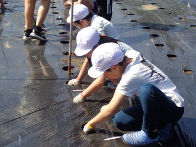 今日は、午後から風が出てきたため、布が大きくなびいて、子どもたちも楽しく学習に取り組めました。