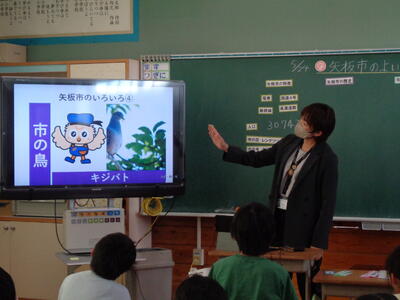 市の人口や市の花・木・鳥のほか、史跡、名産品等についてのお話がありました。子どもたちは、県民の日にちなんだ行事のせいか、「県」のことはよく知っていても「市」のことはあまり知らないようです。それでも、先日の校外学習で行った場所の写真が画面に映されると「この前行ったよ」という声が上がりました。