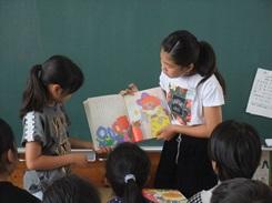 今日の朝の活動は、図書委員会による読み聞かせでした。低・中・高学年にそれぞれ2人ずつの図書委員が行き、絵本の読み聞かせをしました。二人で会話文を分けたり、ページをめくる人と読む人を交代したり、それぞれに工夫して読み聞かせを行っていました。