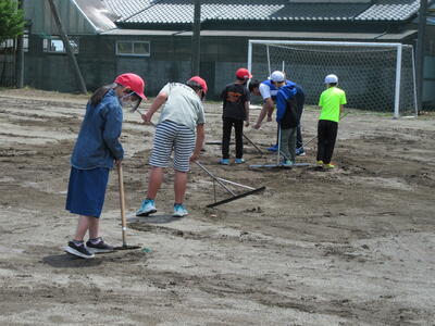 そこで、高学年の児童が、先生方と一緒に一生懸命グラウンドをならしてくれました。