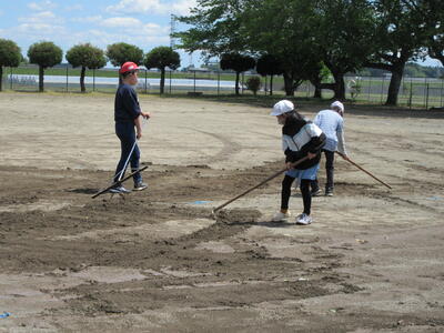 そこで、高学年の児童が、先生方と一緒に一生懸命グラウンドをならしてくれました。