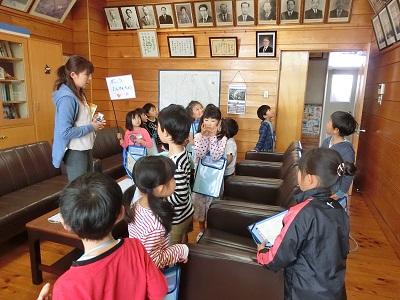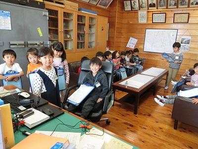 職員室 校長室にかわいいお客さんがきました。1年生の生活科の学習、「学校たんけん」です。興味津々いろいろなものを見つけていました。