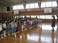 次に。歯の磨き方の復習です。大きな模型を使って説明し、その後音楽に合わせて全校で歯磨きをしました。歯ブラシの先が開いてしまったら、新しい物と交換し、ブラシの先を歯に当てて、みがき残しがないようにみがことが大切です。歯は一生使う大切なものです。正しく磨いて、虫歯があったらすぐに治療しましょう。