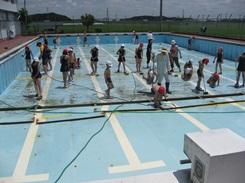 先週の金曜日とても暑い中、低学年の部と高学年の部に分かれて、プール清掃を行いました。低学年はプール周りの草取りやプールサイドの広い部分の掃除を行いました。班ごとに活動しましたがどの班もがんばって働いていました。高学年はプールの中の掃除です。28人手を休めることなく、一生懸命働いている姿は本当に立派でした。