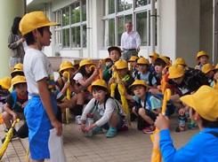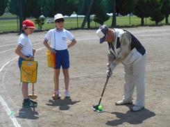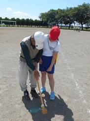 最初はなかなかボールに当たらなかった児童も、丁寧に教えていただき、だんだん夢中になって楽しそうでした。松寿会の皆様、暑い中たいへんありがとうございました。
