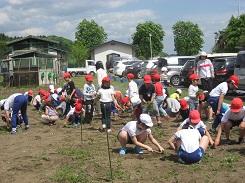 おいしいけんちん汁ができるように、たくさんおいしいサトイモができるように,5、6年生で植え付けをしました。