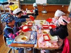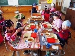 1年生は、給食2日目になりますが、みんなで協力しながら配膳ができています。また、お行儀も良く、家庭での躾がしっかりできているなと感じます。今日はカレーで、みんな残さずたくさん食べていました。