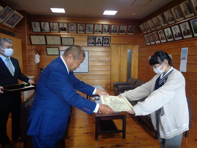 氏家間税会会長にお越しいただき、賞状と副賞が授与されました。