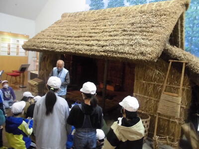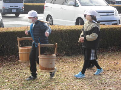博物館で説明を聞いたり、外でもっこ担ぎや水くみ体験をしました。