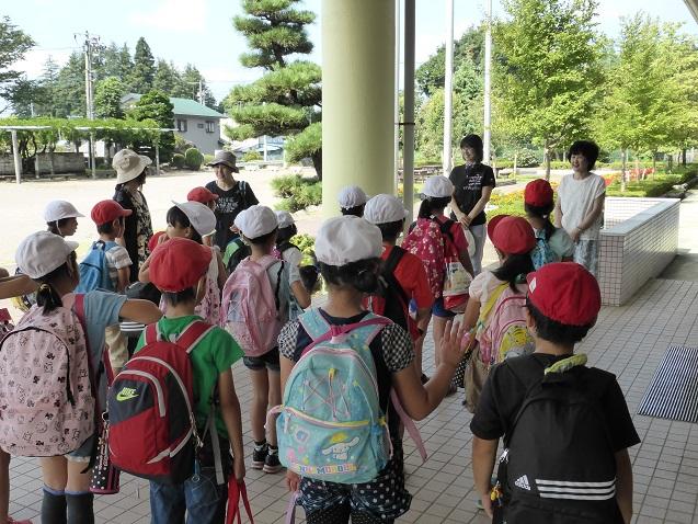 本日は、生活科の学習で、川に住む生き物を見学したり、繭玉の製作をしたりして、自然に親しむ体験をすることを目的としています。午前中は水族館見学と繭玉作りを行い、昼食後に水遊び、アスレチックを行います。本日の予想最高気温は34℃とのことです。水遊びが気持ちよく感じることと思います。