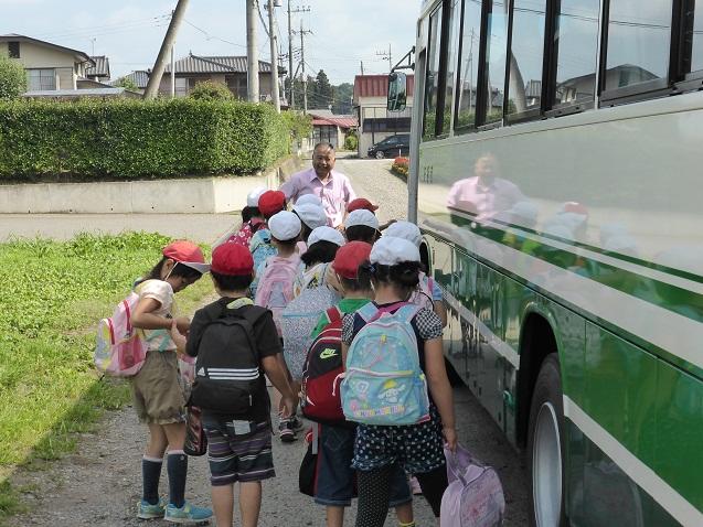8時50分、主任技術員の田代さんが第2グランド周辺の草刈りを行っている近くから、児童はバスに乗り、元気に出かけていきました。