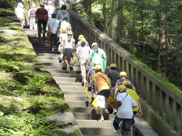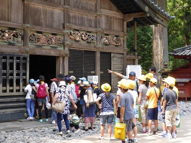 五重塔、三猿で有名な神輿舎を見学した後、陽明門、本社、そして坂下門の眠り猫の下を通り200段以上の階段を昇って奥宮を見学しました。男子児童は、昇るときも戻るときも、それぞれが口々に階段数を数えていました。その後、本地堂で鳴龍を体験し、上神庫の想像の象等を見学し、足尾方面に向かいました。