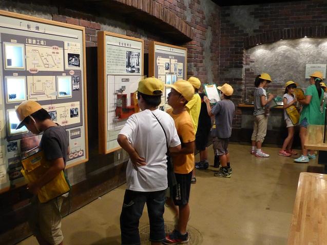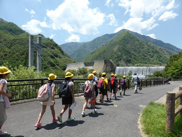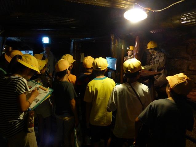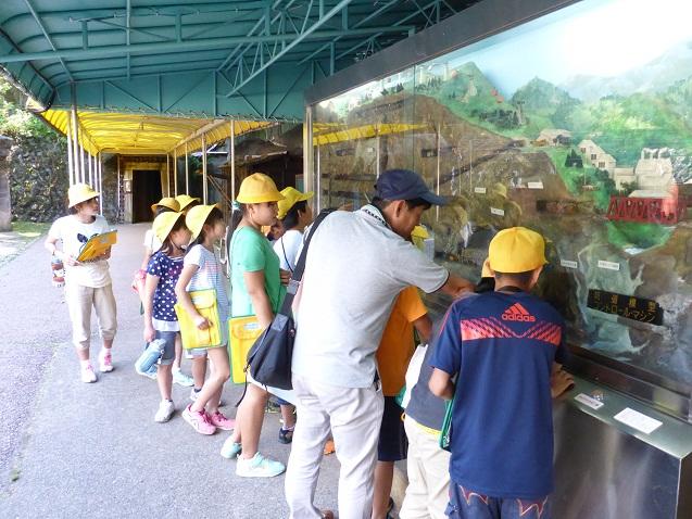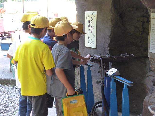 足尾では、はじめに松木渓谷にある銅親水公園での昼食となりました。男子は東屋で、女子は木陰での昼食でした。その後、足尾銅山観光へ行き、銅山の様子について見学をしました。坑道の中は涼しく、外の暑さを忘れそうでした。最盛期には日本で算出される銅の40%が足尾で生産されていたことや、坑道の長さを合計すると1200km以上(東京から九州までの距離)あるとの説明もありました。坑道を出たところで削岩機の体験コーナーがあったので、男子児童がおそるおそる体験していました。