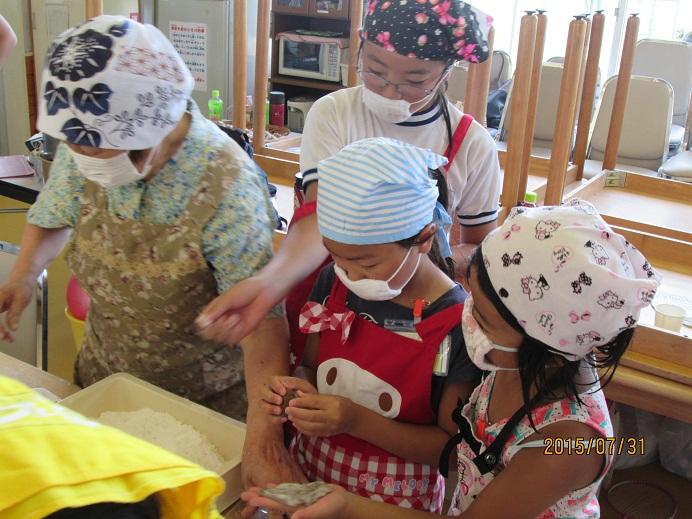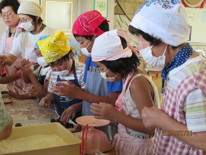7月31日にひまわりスクールでは、体験学習で、ひまわりスクールの運営スタッフをなさっている櫻井義子様を講師にお迎えをして、地域の方々のご協力をいただきながら、釜の蓋まんじゅう作りをしました。