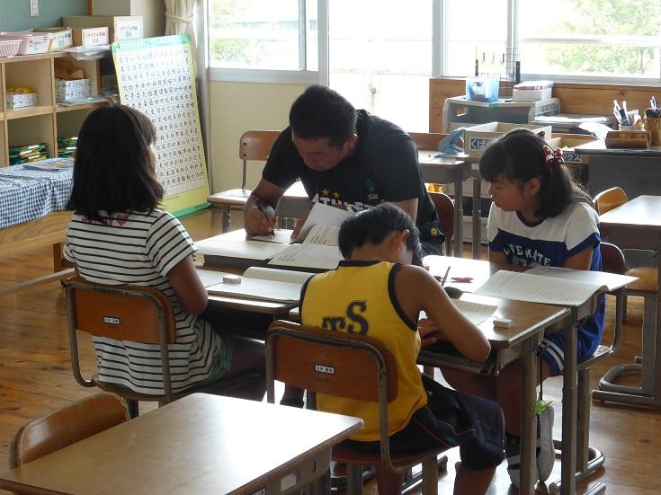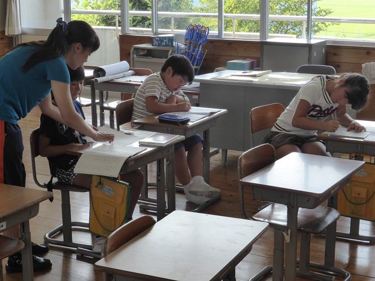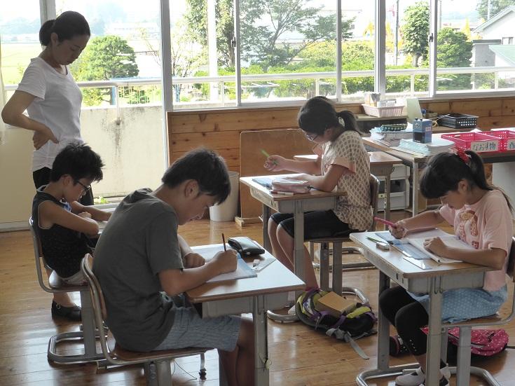 4月から今まで行ってきた学習の補強や夏休みの課題の補助等を目的として、今年の夏は希望者を対象に各学年2回のサポートデーを行うことにしました。 8月5日は、1~5年生が対象になっています。1・2年生はまとまって学習をしていますが、3年生以上は各学級で学習をしています。