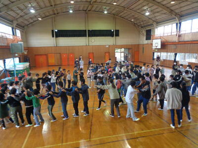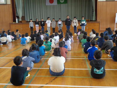 最後に、先頭になった児童に、放送委員の児童がインタビューしましたが、する方もされる方もはっきり話すことができ、下学年の児童のお手本になり、大変立派でした。そして、楽しい集会でした。