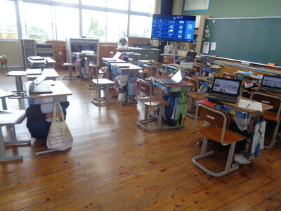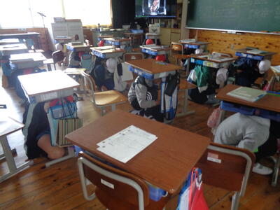 あえて子どもたちには事前に知らせず、様子を見ましたが、どの学年もしっかり机の下にもぐり、頭を守ることができました。