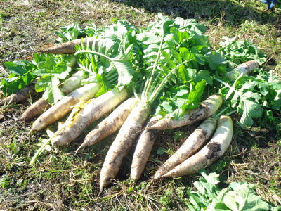 2校時は2・5年生が大根を、3校時は1・6年生がねぎと人参を、4校時は3・4年生が白菜を収穫しました。