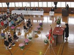 6年生のサポートによる「新入生入場」、「国歌斉唱」、新入生6名の「呼名」、「学校長式辞」、「教育委員会のことば」、来賓による「お祝いのことば」、「来賓の方々のご紹介」、児童による「新入生を迎えることば」、「校歌斉唱」の順に進んでいきました。