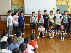 音読集会 投稿日時 : 2016/10/25 学校管理者 カテゴリ: 10月25日の朝、1年生が国語の教材にある「くじらぐも」の音読を、物語の中に登場する1年2組の子どもの役をする児童、くじらぐもの役をする児童、ナレーションの役をする児童の役割分担で音読しました。音読の途中では、場面に合せて合唱をしたり、みんなで雲に乗るためにジャンプをしたりするなど、手振り身振りを交えながらの楽しい音読劇でした。