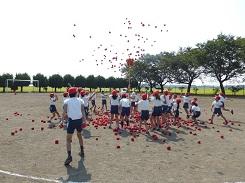 1校時は運動会の練習で、まり入れ、大玉転がし、応援合戦の隊形の確認を第2校庭で行いました。まり入れでは、2回のまり入れの合計で、赤が29個、白が36個となり、今回は白組の勝利でした。声を合わせて一斉にまりを投げ入れる方法と、それぞれがまりを投げ入れる方法のどちらがいいのでしょうか。