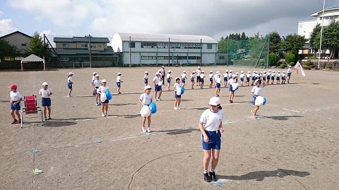 給水タイムのあと、応援合戦の入場を練習し、練習が必要だった応援の振り付け等を紅白に分かれて練習しました。高学年の児童が応援歌の時の動きを、低学年に指導する姿がありました。その後、よさこいソーランの位置を確認し練習を終えました。