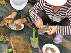 今回の活動は、ひまわりの種取りです。花の部分を切る人、種を取り出す人、茎を抜く人とそれぞれ分担して活動します。たくさんの種を集めることができました。枯れた茎もきれいに抜き、ひまわり畑を片付けることもできました。