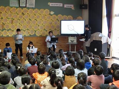 今朝は2時間遅れの登校ではありましたが、登校時刻から3時間目までの時間を利用して、計画通り保健委員会による集会を行いました。先日学校保健委員会で発表した「健康バランスチェックシートのまとめ」発表を行いました。6年間のアンケートのまとめなので少し難しいところもありましたが、子ども達は「自分は生活のリズムがすこしできていないので直したいと思いました」とか「自分は3つずつしか〇がなかったのでもう少しつけられるようになりたい」などと感想を発表することができ、低学年でも自分のこととして聞いていたので、健康面から自分を振り返る良い機会になりました。