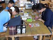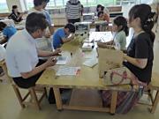 プラ版工作は、プラスチックの板に油性マジック等で色を付けたものを、オーブントースターで熱を加え収縮させて、キーホルダーなどを作るものです。今回は、予め各自が用意してきた下絵をプラ版に写して製作しました。親子で座り工作している姿がほほえましく感じました。